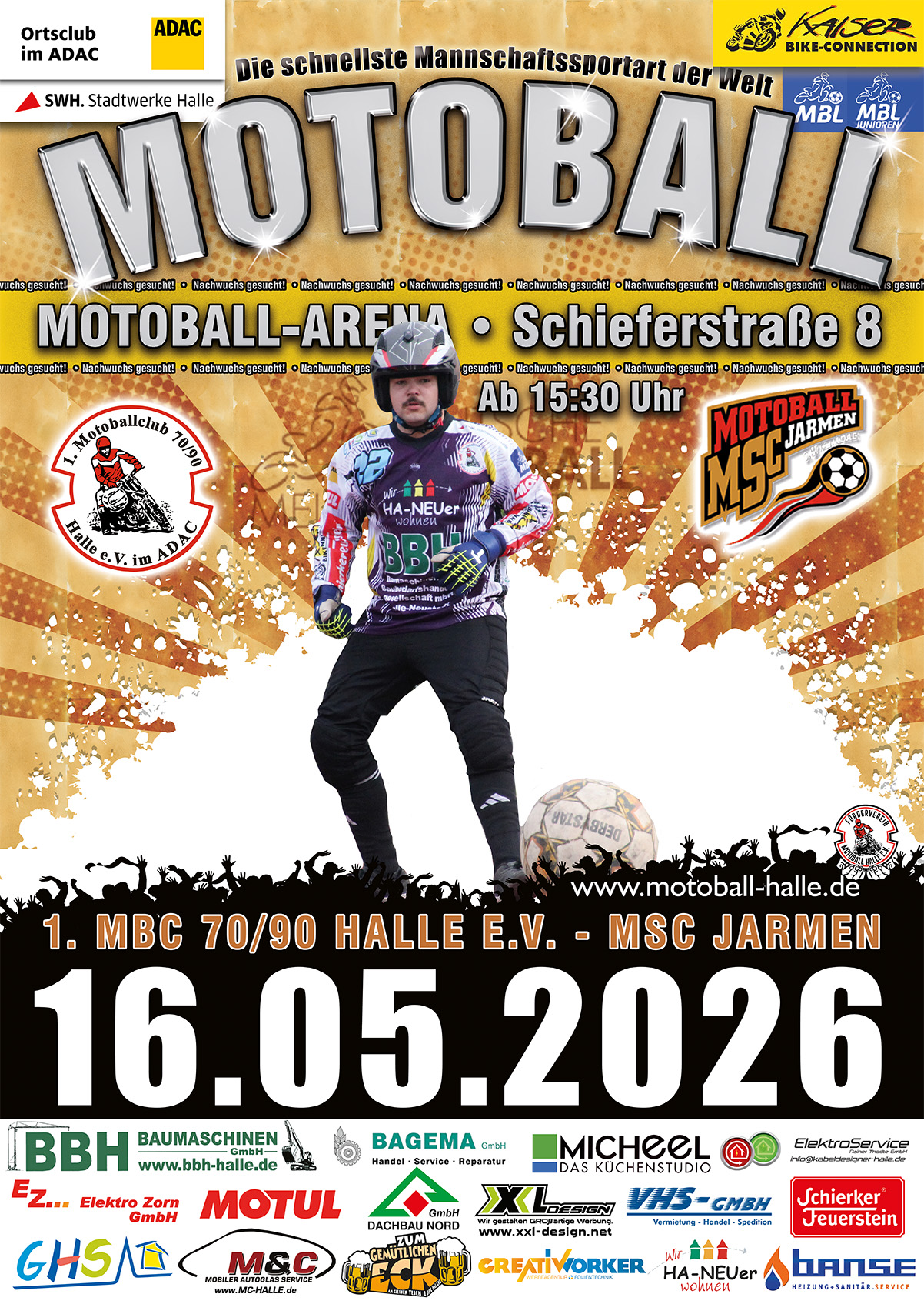 Der 1. MBC 70/90 Halle e.V. spielt mittlerweile über 55 Jahren Motoball in Halle und seit 1993 sogar 1.Bundesliga. Motoball ist wohlgemerkt die schnellste Mannschaftballsportart der Welt – Fußball auf Motorrädern fasst den Sport wohl am besten zusammen. Der MBC ist der einzige Motoballverein in Mitteldeutschland und somit sind dies mindestens 3 gute Gründe um einmal bei den Heimspielen dabei zu sein!