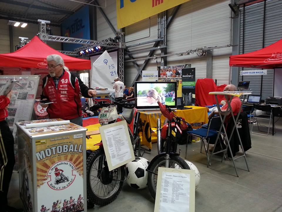 Auch in Halle hatten wir viel zu tun. Ein regen Besucherstrom hatten wir zu verzeichnen. Unsere Flyer gingen weg wie warme Semmeln. Wir hatten auch hier viele Neugierige die alles über den Motoballsport, die Technik und Regeln wissen wollten. Selbstverständlich konnten wir alle Frage beantworten.